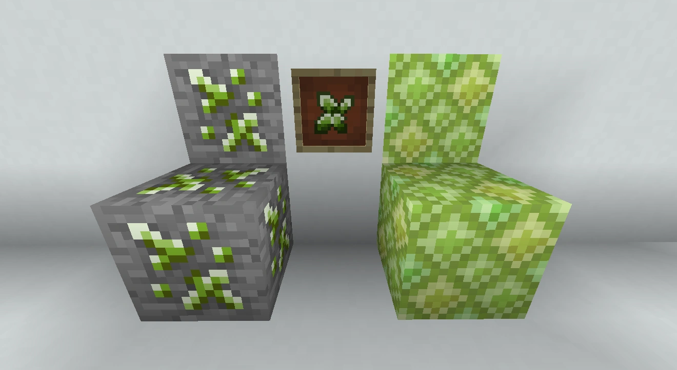 | Biotic Blocks | Origin Grass Block • Rooted Sand • (Flesh - porous) • Toadstool Block • Glowshroom Block • Glowing Moss Carpet • Glowing Moss Block • Glowworm Silk (Block) • Spider Egg • Origin Leaves • Flowering Oak Leaves • Rainbow Birch Leaves • Yellow Autumn Leaves • Orange Autumn Leaves • Maple Leaves • (Fir Log - wood, stripped, stripped wood, planks, stairs, slab, fence, fence gate, door, trapdoor, button, boat, chest boat, leaves) • (Redwood Log - wood, stripped, stripped wood, planks, stairs, slab, fence, fence gate, door, trapdoor, button, boat, chest boat, leaves) • (Cherry Log - wood, stripped, stripped wood, planks, stairs, slab, fence, fence gate, door, trapdoor, button, boat, chest boat, pink blossoms, white blossoms) (Saplings - origin, flowering oak, rainbow birch, yellow autumn, orange autumn, maple, fir, redwood, white cherry, pink cherry, mahogany, jacaranda, palm, willow, dead, magic, umbran, hellbark) • Rose • Violet • Lavender • Wildflower • Orange Cosmos • Pink Daffodil • Pink Hibiscus • Glowflower • Wilted Lily • Burning Blossom • Blue Hydrangea • Goldenrod • Willow Vine • Spanish Moss• Sprout • Bush • Clover • Huge Clover Petal • Dune Grass • Desert Grass • Dead Grass • Cattail • Barley • Sea Oats • Reed • Watergrass • Dead Branch • Bramble • Toadstool • Glowshroom • Eyebulb • Pus Bubble • Flesh Tendons • Hair • Flowering Vine | |